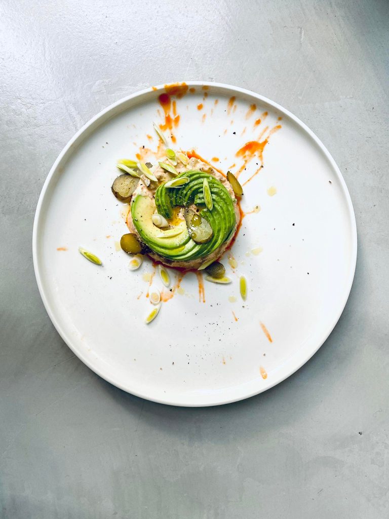 Combine all ingredients well into a bowl without the avocado, assemble nicely and add the avocado cut into slices on top.